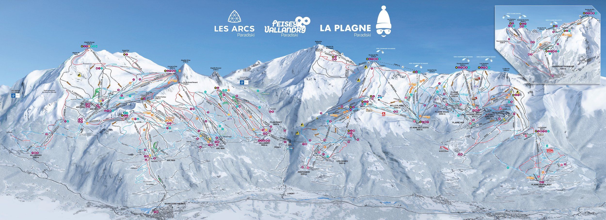 Tief verschneite Almen und Felsgipfel, die bis über 3.200 Meter aufragen und perfekt gewalzte Pisten - in einem der größten und abwechslungsreichsten Skigebiete der Welt bleiben keine Wünsche offen! Die Skigebiete von Les Arcs und La Plagne sind seit 2004 durch den zweigeschossigen "Vanoise Express" verbunden, sodass Sie bequem zwischen den Gebieten pendeln und sich immer die besten Pisten aussuchen können. Diese Seilbahn ist ganz nebenbei die größte und schnellste ihrer Art weltweit - ein absolutes Erlebnis!